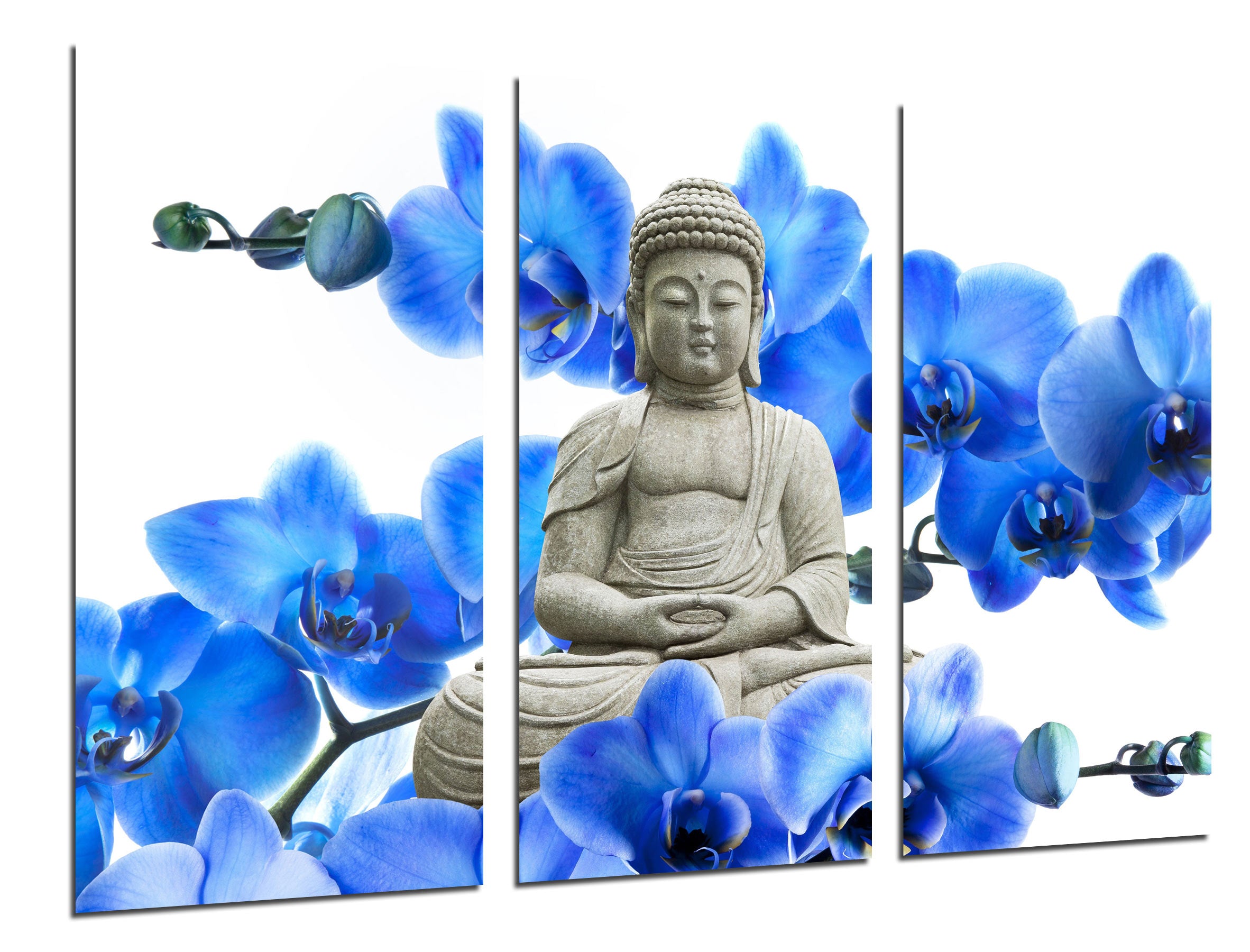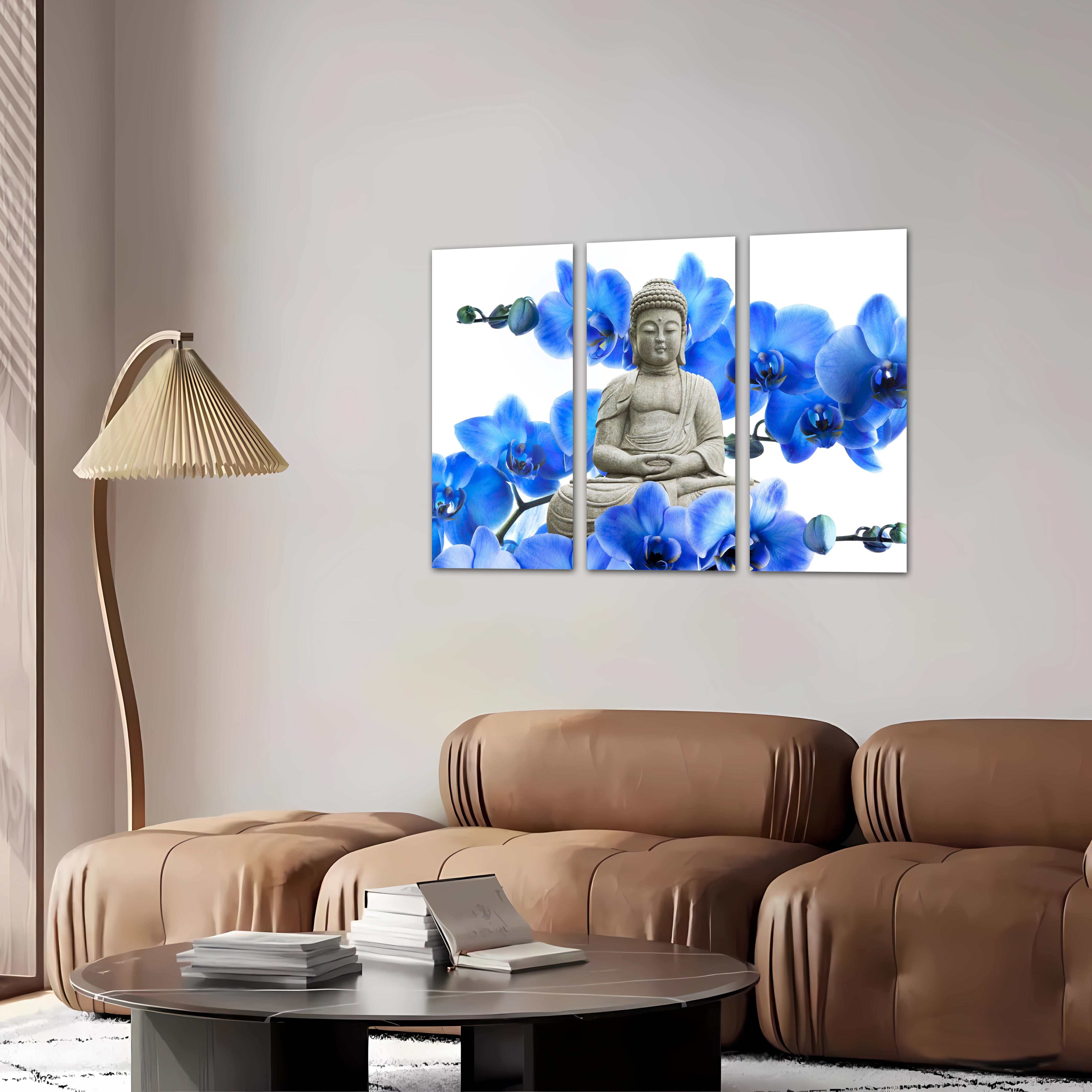 Tríptico buda oriental, ramas, azul escultura ,relajacion, meditacion, zen