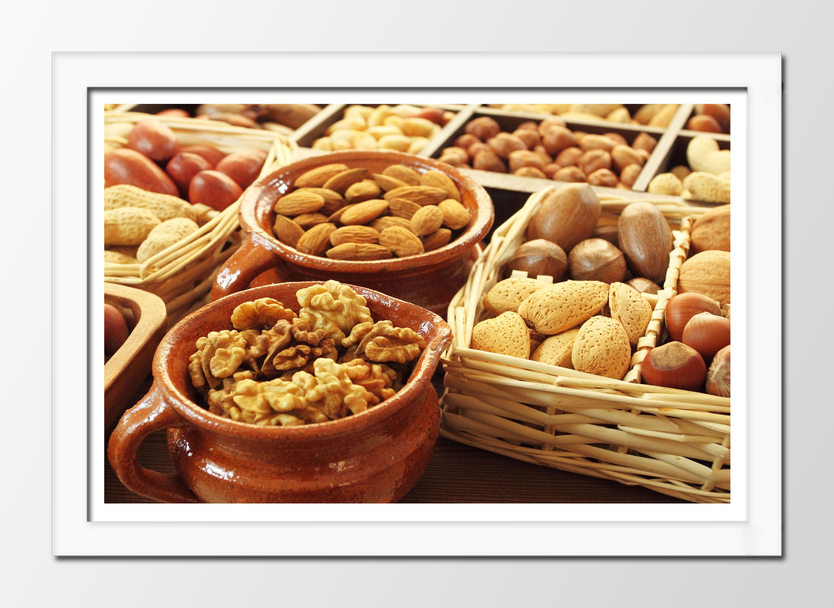 Cuadro enmarcado blanco frutos secos, almendras, nueces, aperitivos