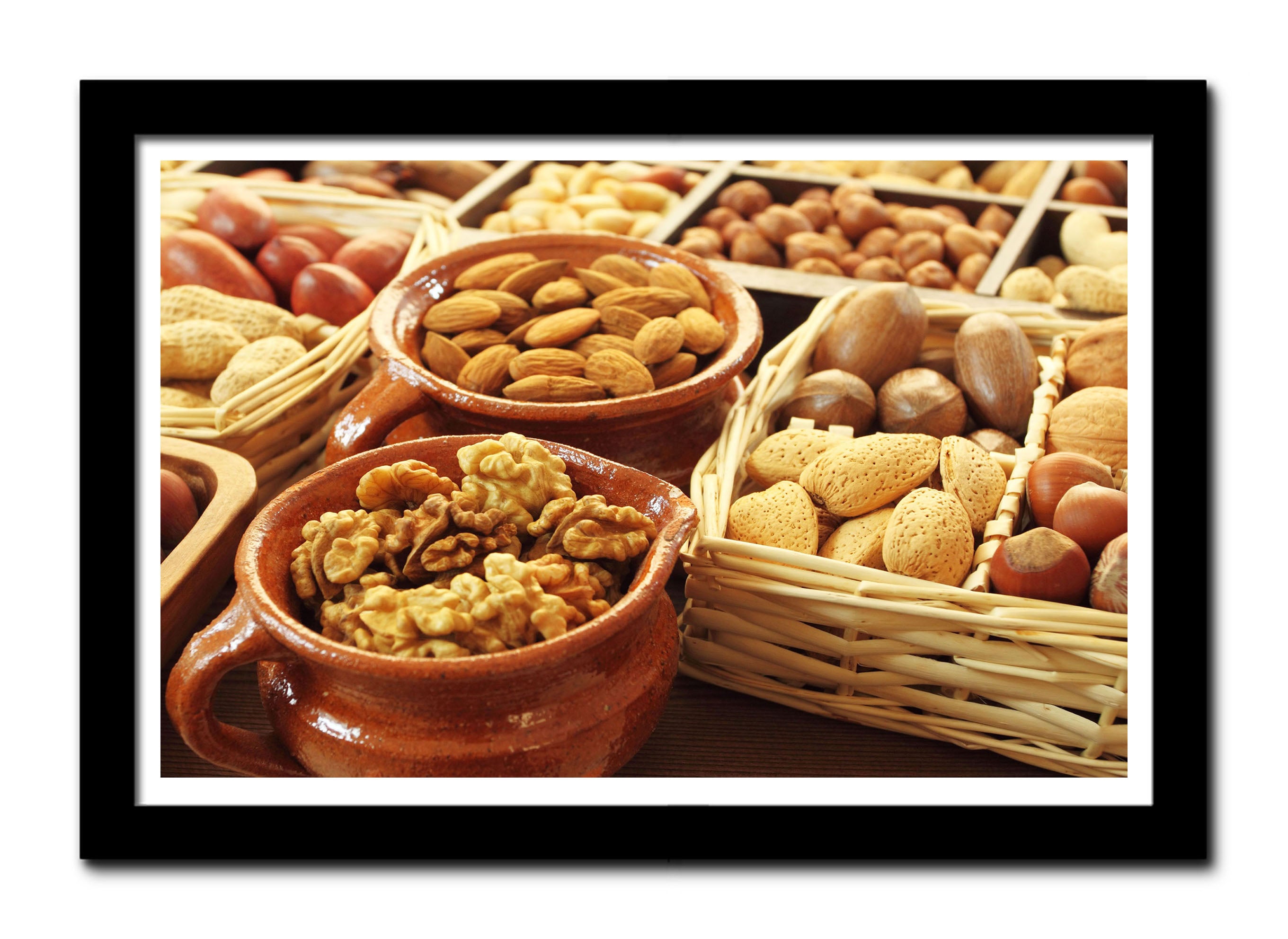 Cuadro enmarcado negro frutos secos, almendras, nueces, aperitivos