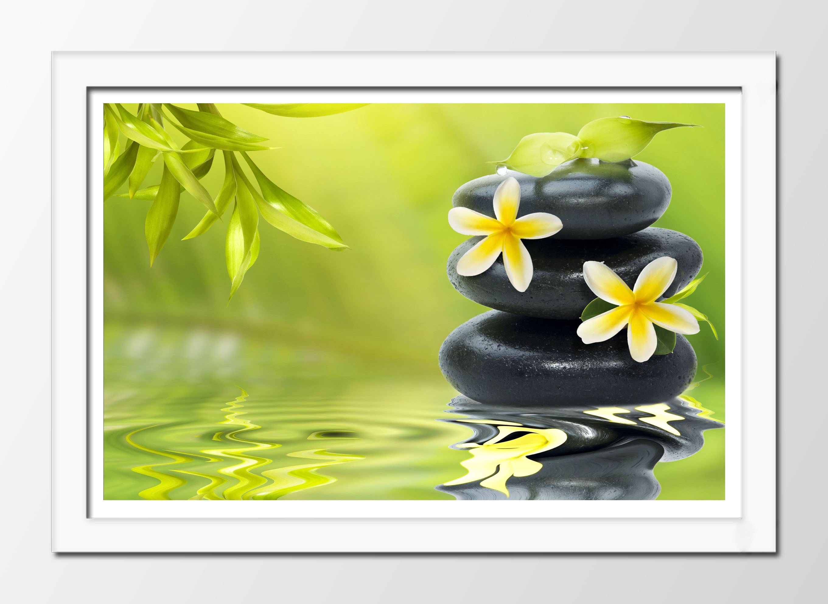 Cuadro enmarcado blanco oriental ,piedra, tonos verde, decoracion, relajacion