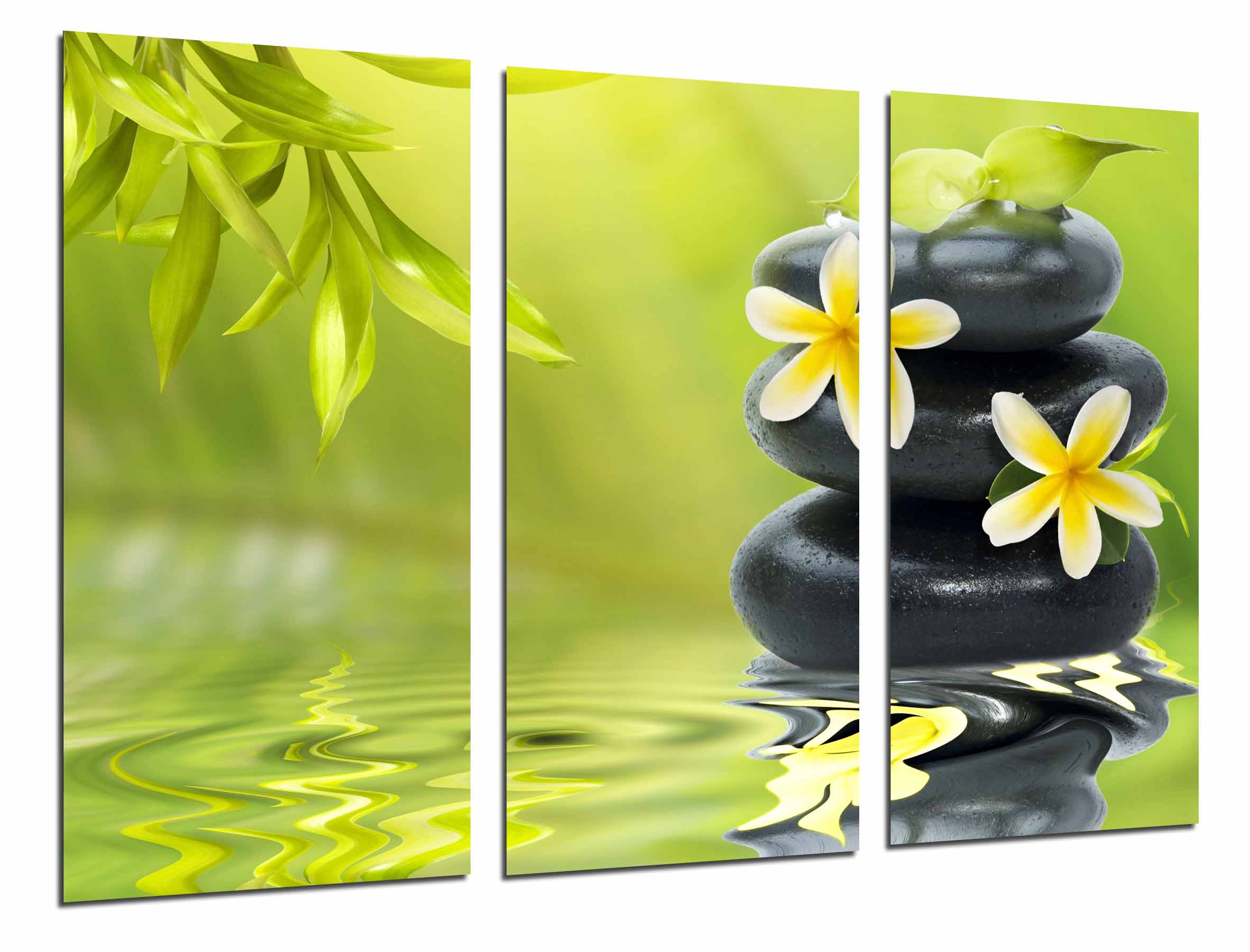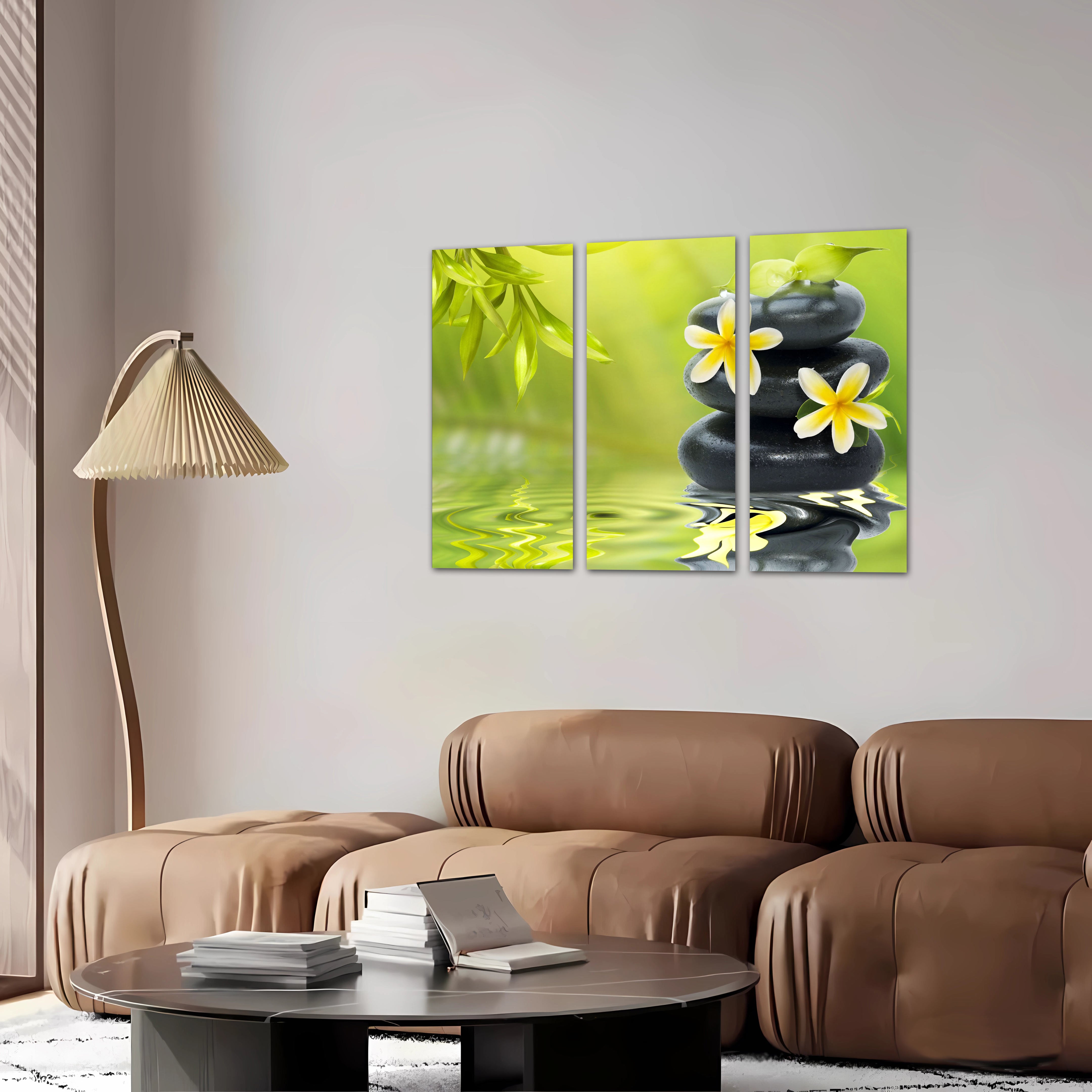 Tríptico oriental ,piedra, tonos verde, decoracion, relajacion